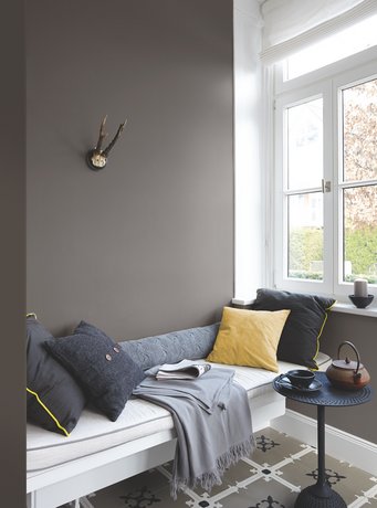 Die Farbpersönlichkeit des dunklen Graus traut sich zu, einen ganzen Raum zusammenzuhalten. Optisch stützend und markant, bleibt die Farbe betont zeitlos. Doch die ehrwürdige Stärke der Wandfarbe verbirgt einen tiefsinnig-behaglichen Charakter.