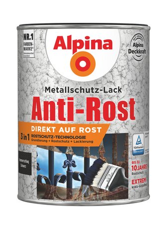 | Untergrund | Eisenmetalle. Nicht-Eisenmetalle nach Untergrundvorbehandlung und Grundierung mit Alpina Spezial-Haftgrund. Der Untergrund muss tragfähig, fest, sauber, trocken und fettfrei sein. Losen Rost mit Drahtbürste entfernen. Zur Ausbesserung von Unebenheiten/Fehlstellen können Sie Alpina Universal-Lackspachtel verwenden. |
