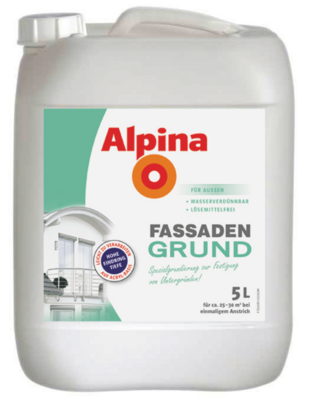 Alpina FassadenGrund ist eine lösemittelfreie Spezial-Grundierung für festigende und egalisierende Grundanstriche auf grob porösen, saugenden und leicht sandenden Putz- und Betonflächen. Die Grundierung überzeugt durch ihre hohe Eindringtiefe sowie eine leichte Verarbeitung und bildet die ideale Basis für alle Alpina Fassadenfarben.