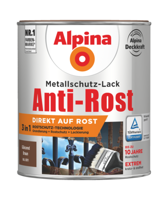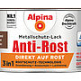 | Untergrund | Eisenmetalle. Nicht-Eisenmetalle nach Untergrundvorbehandlung und Grundierung mit Alpina Spezial-Haftgrund. Der Untergrund muss tragfähig, fest, sauber, trocken und fettfrei sein. Losen Rost mit Drahtbürste entfernen. Zur Ausbesserung von Unebenheiten/Fehlstellen können Sie Alpina Universal-Lackspachtel verwenden. |