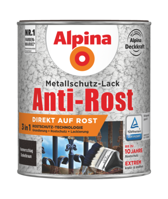 | Untergrund | Eisenmetalle. Nicht-Eisenmetalle nach Untergrundvorbehandlung und Grundierung mit Alpina Spezial-Haftgrund. Der Untergrund muss tragfähig, fest, sauber, trocken und fettfrei sein. Losen Rost mit Drahtbürste entfernen. Zur Ausbesserung von Unebenheiten/Fehlstellen können Sie Alpina Universal-Lackspachtel verwenden. |