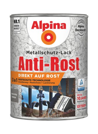 | Untergrund | Eisenmetalle. Nicht-Eisenmetalle nach Untergrundvorbehandlung und Grundierung mit Alpina Spezial-Haftgrund. Der Untergrund muss tragfähig, fest, sauber, trocken und fettfrei sein. Losen Rost mit Drahtbürste entfernen. Zur Ausbesserung von Unebenheiten/Fehlstellen können Sie Alpina Universal-Lackspachtel verwenden. |