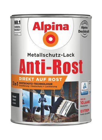 | Untergrund | Eisenmetalle. Nicht-Eisenmetalle nach Untergrundvorbehandlung und Grundierung mit Alpina Spezial-Haftgrund. Der Untergrund muss tragfähig, fest, sauber, trocken und fettfrei sein. Losen Rost mit Drahtbürste entfernen. Zur Ausbesserung von Unebenheiten/Fehlstellen können Sie Alpina Universal-Lackspachtel verwenden. |
